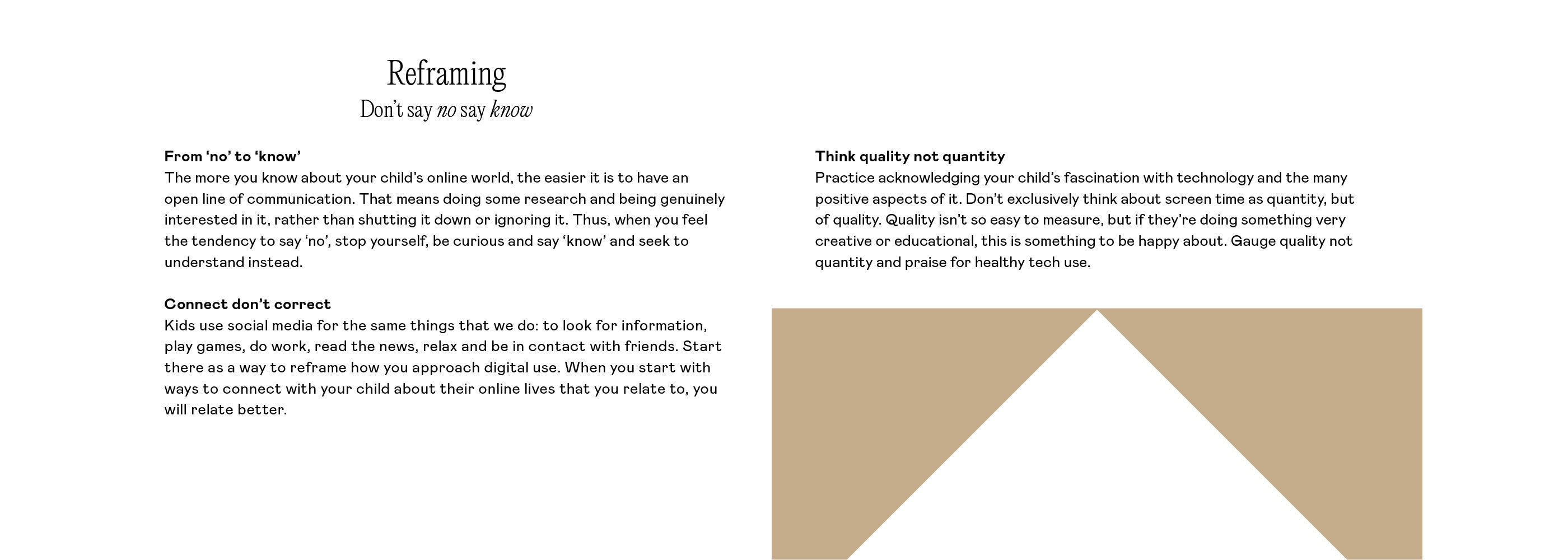 The more you know about your child’s online world, the easier it is to have an open line of communication. That means doing some research and being genuinely interested in it, rather than shutting it down or ignoring it. Thus, when you feel the tendency to say ‘no’, stop yourself, be curious and say ‘know’ and seek to understand instead.