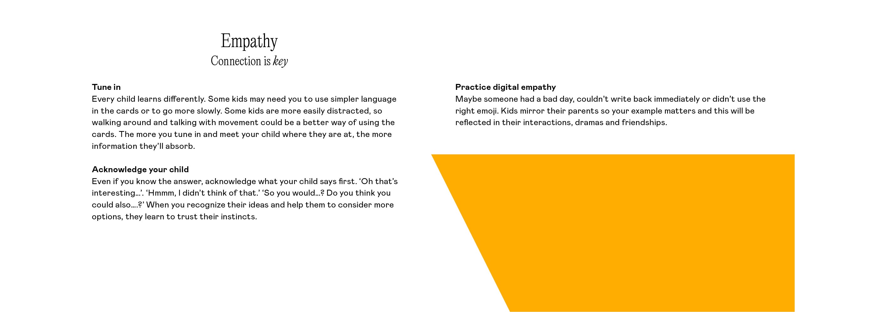 The best thing is to show genuine interest in what your child plays online (even if you don’t want to). The cards build trust by creating a bridge into their online life. The digital play space is just as real for children as the physical play space, and they like us to be involved.